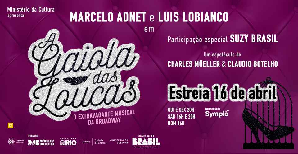 Em cena, uma história absolutamente atual toma conta do palco em uma superprodução musical com as versões de Claudio Botelho para as músicas e letras de Jerry Herman. Além da direção, Charles Möeller também assinará a cenografia da montagem, que contará com a coordenação artística de Tina Salles. ‘A Gaiola das Loucas’ estreia após uma série de sucessos que a dupla enfileirou nos últimos anos, como ‘Mamma Mia!’, ‘O Jovem Frankenstein’, ‘A Noviça Rebelde’ e ‘Hair’.